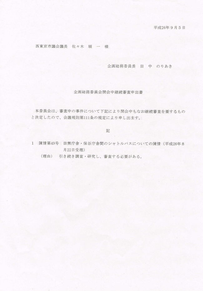 田無庁舎・保谷庁舎間のシャトルバスについての陳情   ⇒ 企画総務委員会付託 ⇒ 継続審議